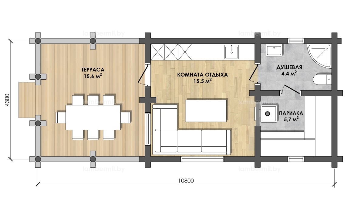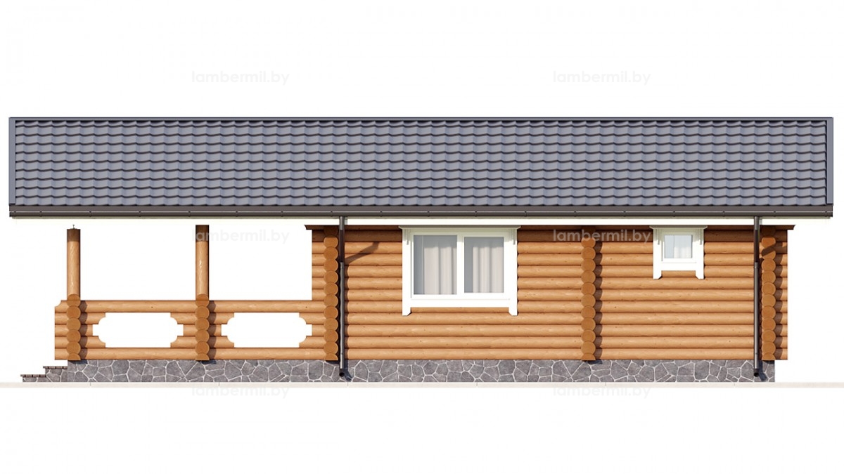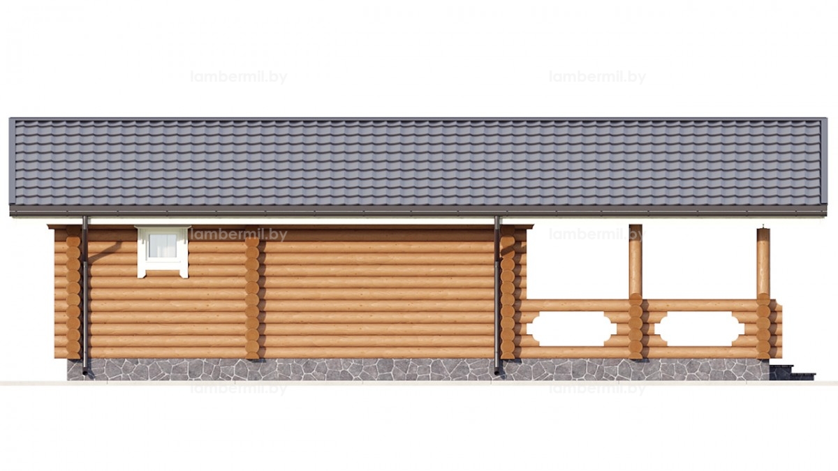 Проект деревянной бани 41 - красивая массивная баня из оцилиндрованного бревна с большой террасой. Данная баня является более просторной модификацией проекта бани 34 с увеличенной комнатой отдыха и террасой. Баня имеет размеры в плане 10,8х4,3 м. Проект сочетает оптимальный набор помещений: просторную крытую террасу 16 м2, большую светлую комнату отдыха, душевую и парилку. В этой бане можно не только с комфортом попариться, но и прекрасно отдохнуть в компании друзей.