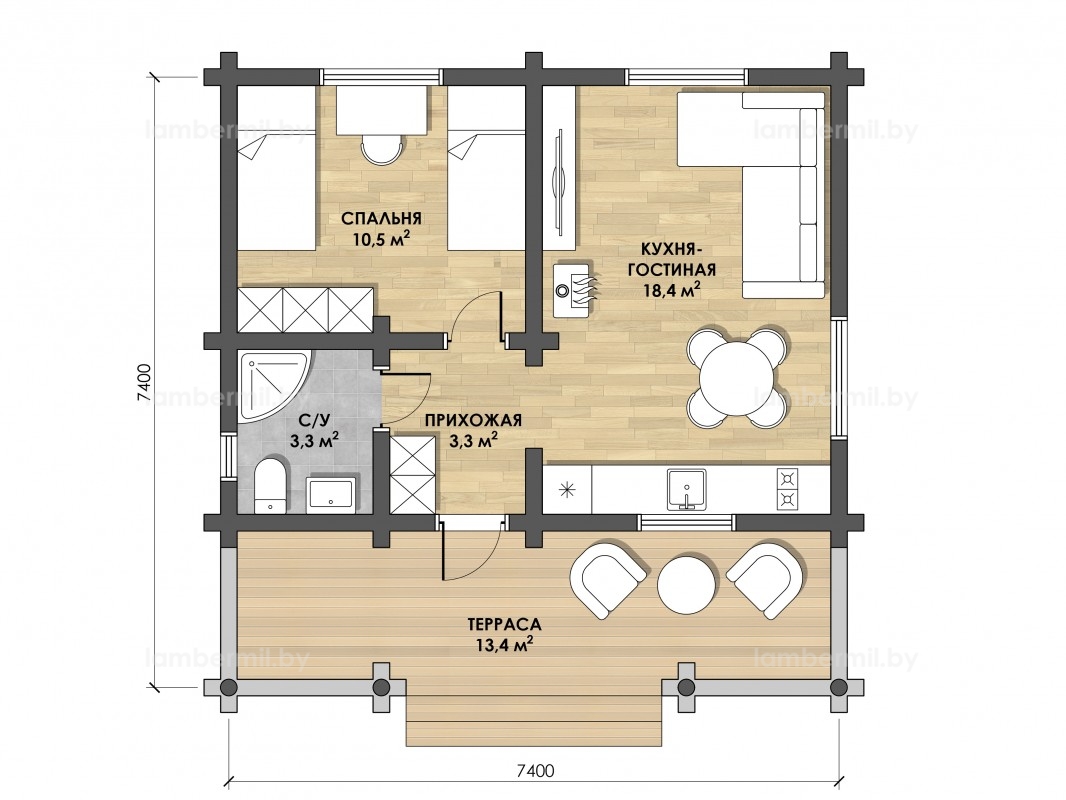 Осевые размеры: 7.4 х 7.4 м