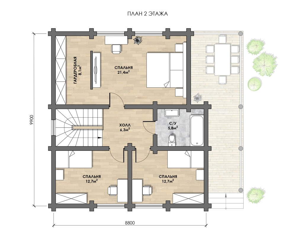 Проект деревянного дома 161 – это удобный двухэтажный жилой дом из оцилиндрованного бревна площадью 161 м². Данный деревянный дом отличается большим количеством остекления. В гостиной и жилых комнатах предусмотрены большие панорамные окна от пола до потолка. Благодаря этому дом становится воздушным и светлым внутри. Особенно гармонично такой дом может разместиться в живописном месте – рядом с лесом или водоемом.